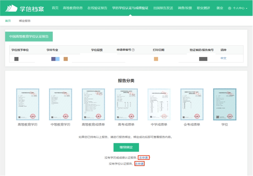 3、根据个人实际情况,点击“没有学历或成绩认证报告,去申请”或“没有学位认证报告,去申请”
