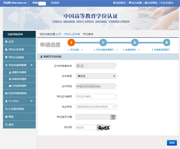 6、填写学位证书编号,毕业院校,学位授予日期及验证码后,点击“查询”。
