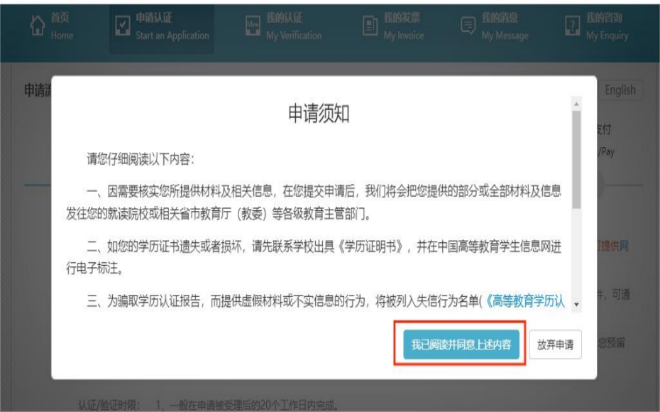 5、阅读“申请须知”后,点击“我已阅读并同意上述内容”